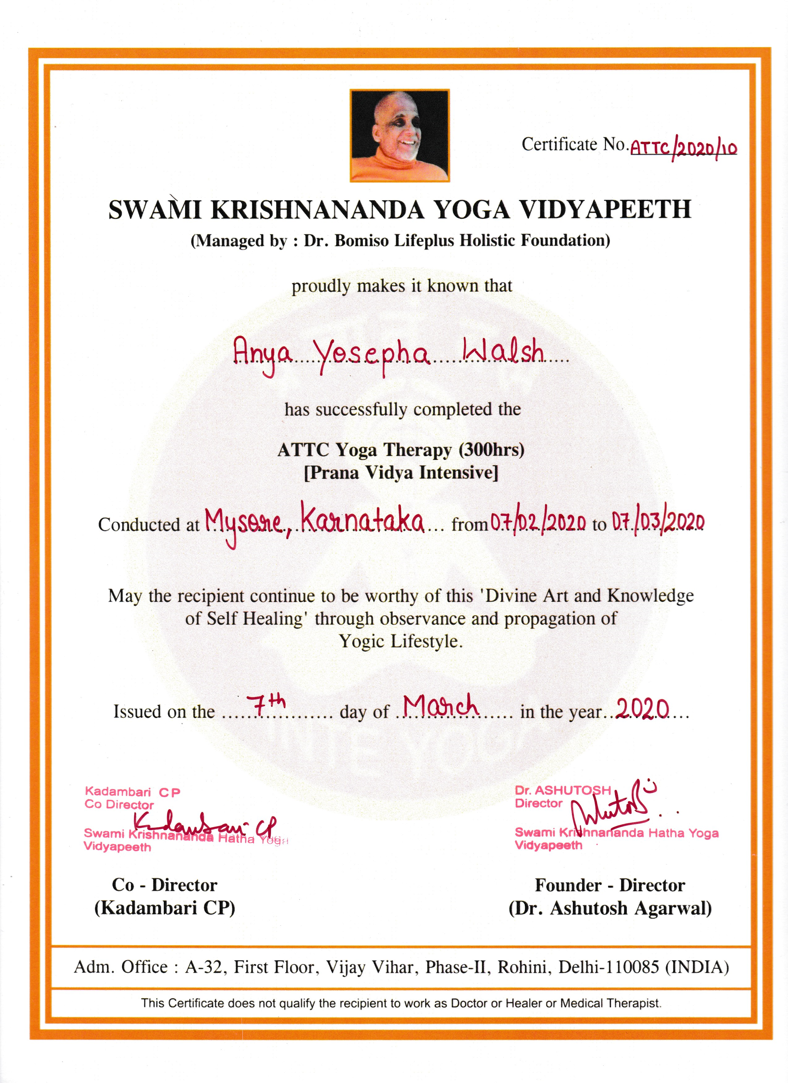 Trained in Hatha Yoga, Pranayama, Yoga Nidra, Chakra yoga with Sivananda’s 3rd generation disciple, Ashutosh. January - February 2020